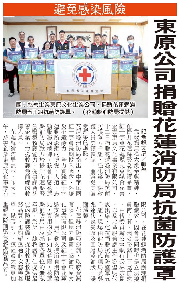 東原公司捐贈花蓮消防局抗菌防疫面罩