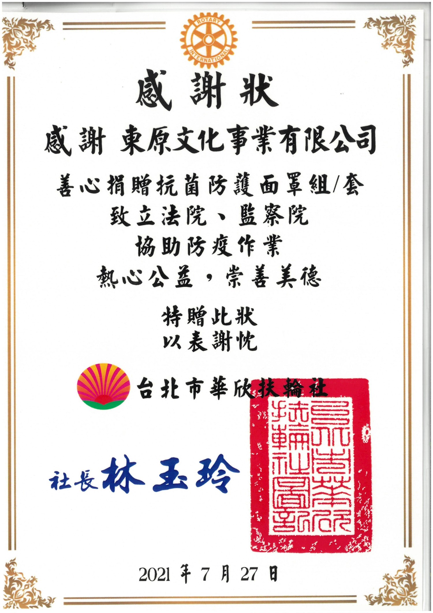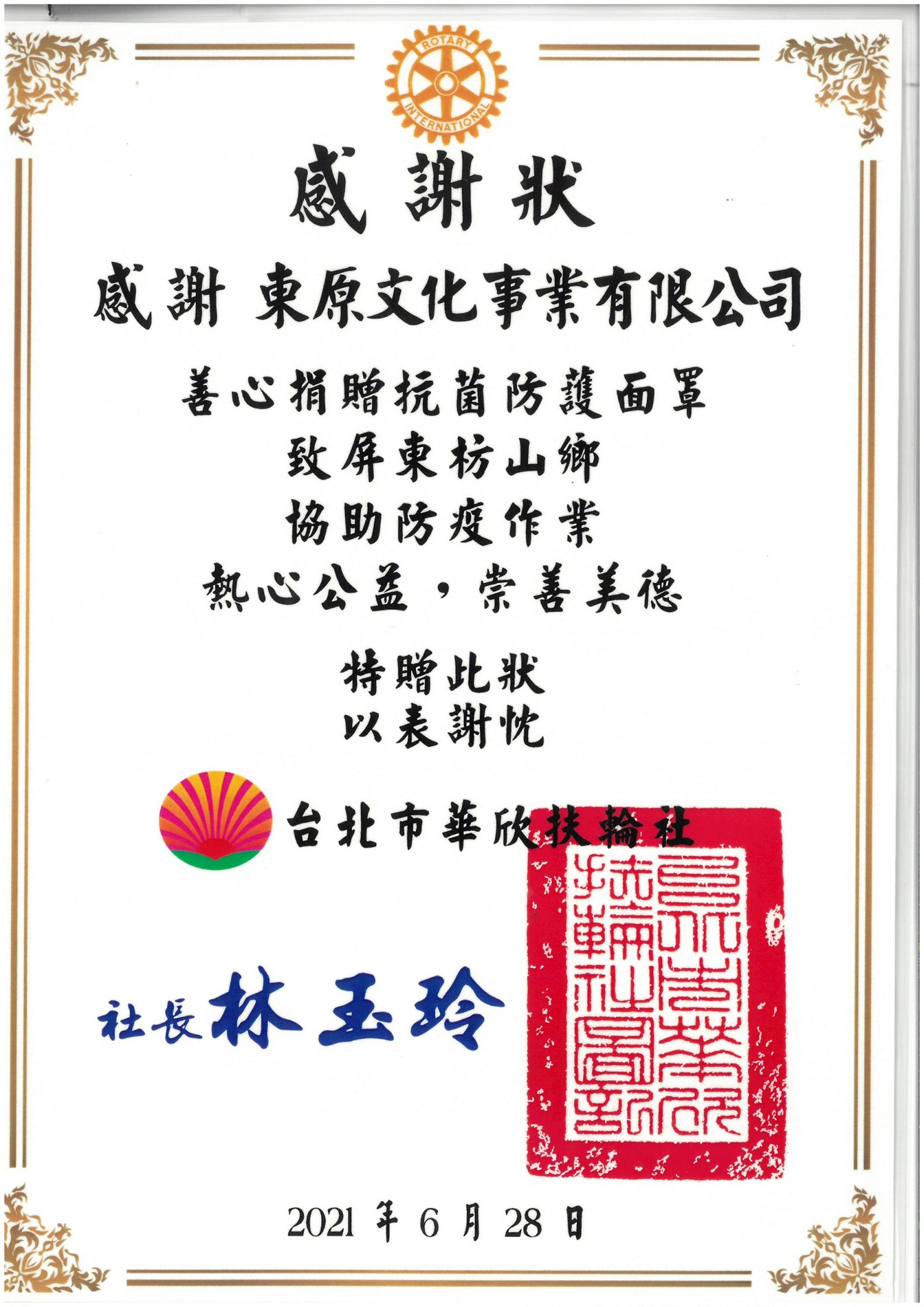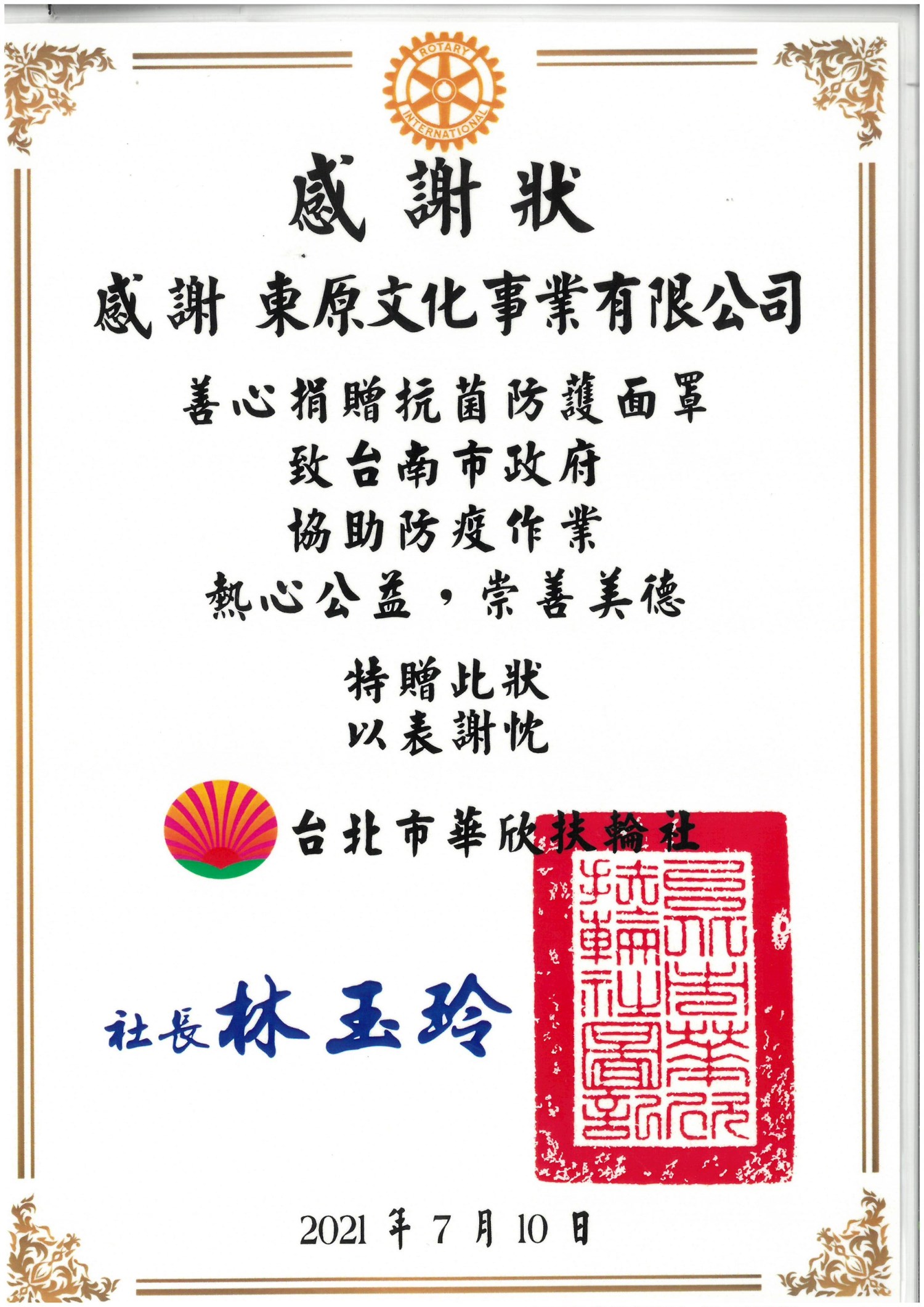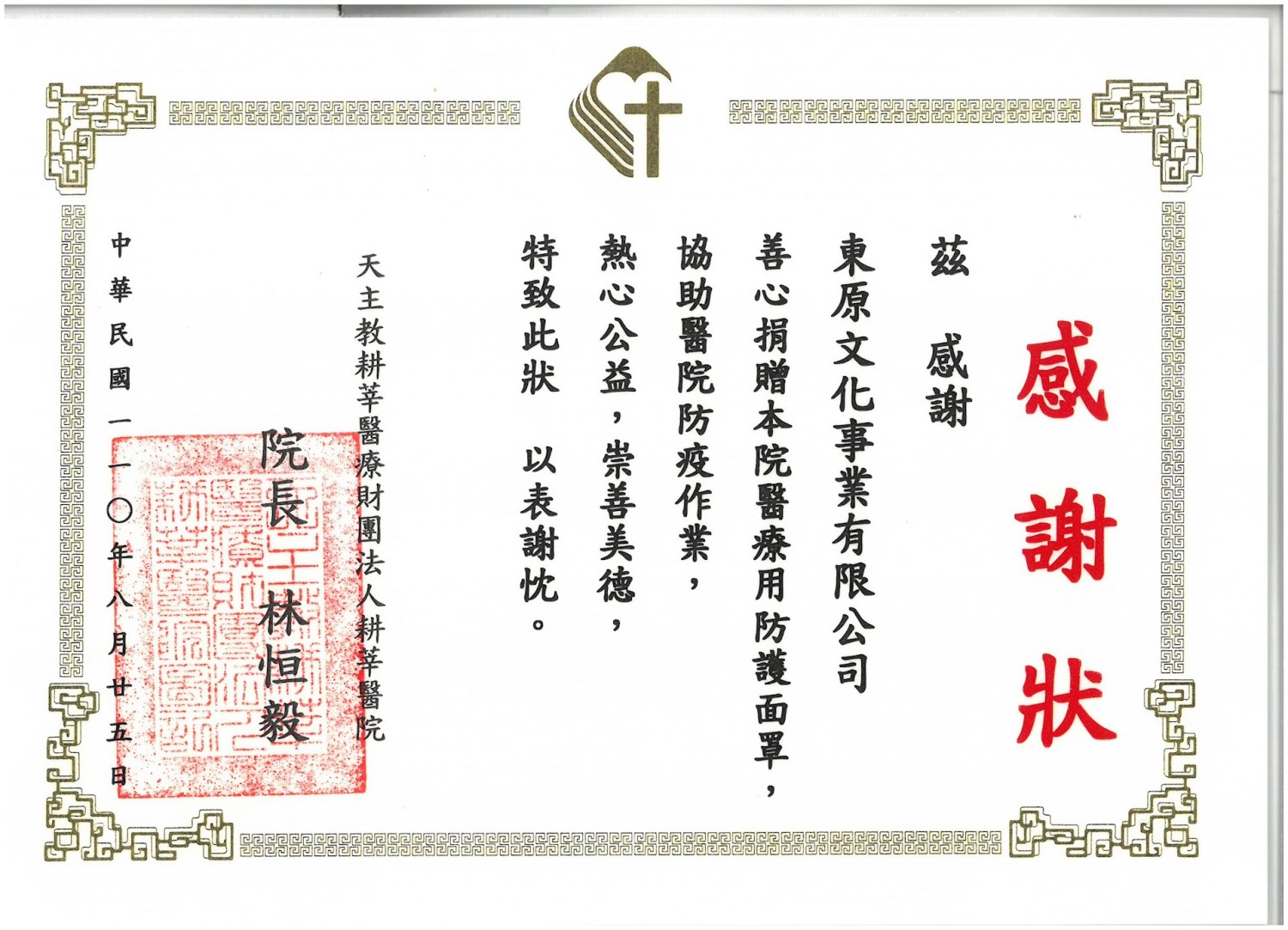 東原文化王總監 捐贈多數「抗菌防護面罩」給各學校、醫院等等,並也協助發送「愛心便當」關懷獨居老人及低收入戶民眾