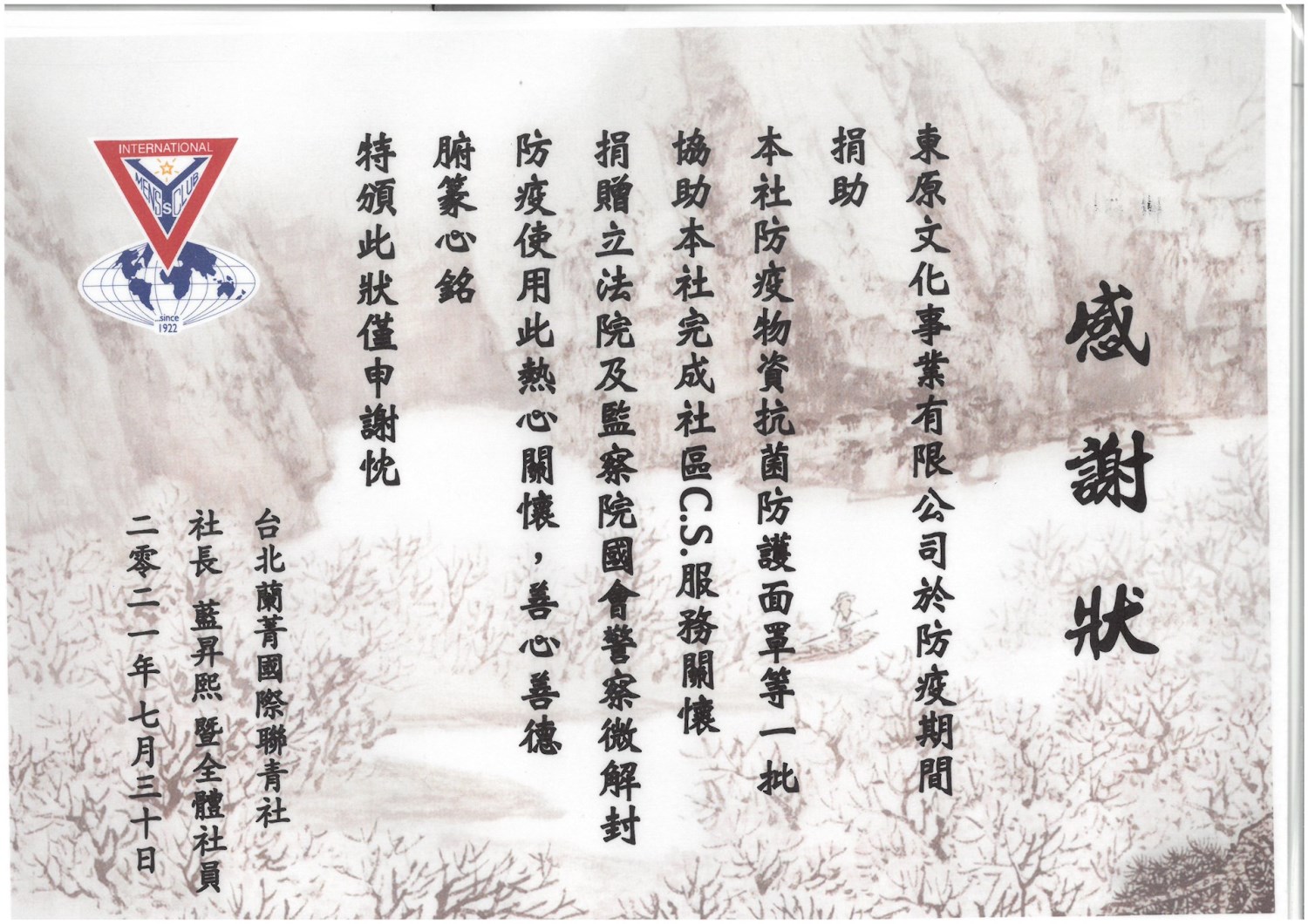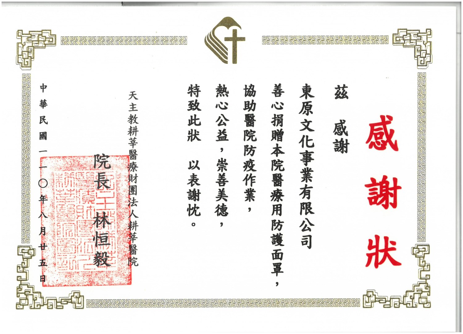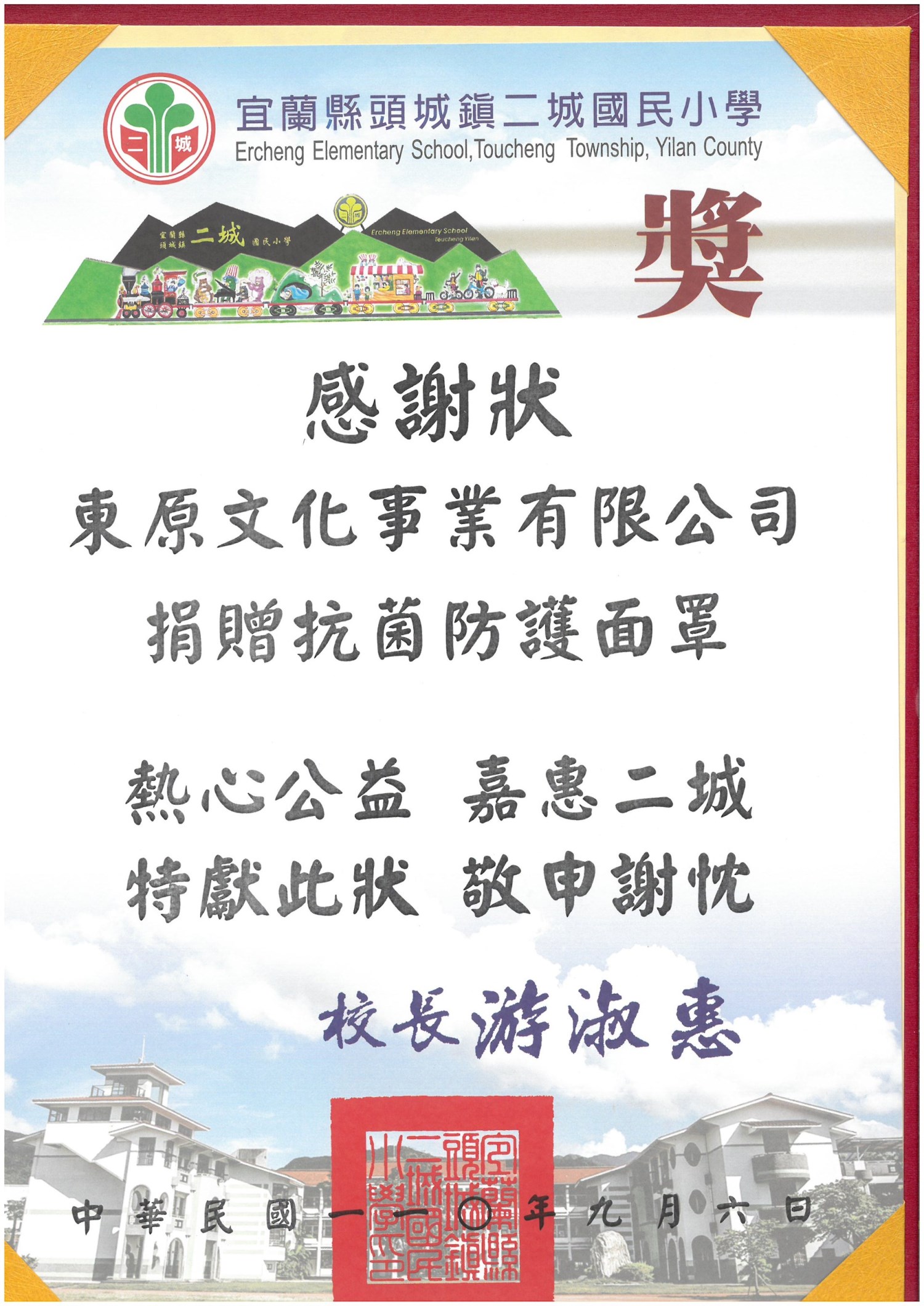 東原文化王總監 捐贈多數「抗菌防護面罩」給各學校、醫院等等,並也協助發送「愛心便當」關懷獨居老人及低收入戶民眾