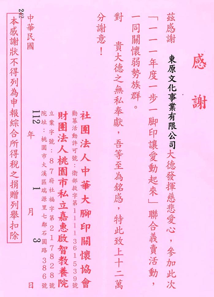 2023年1月4日 東原公司捐款,財團法人桃園市私立嘉惠啟智教養院
